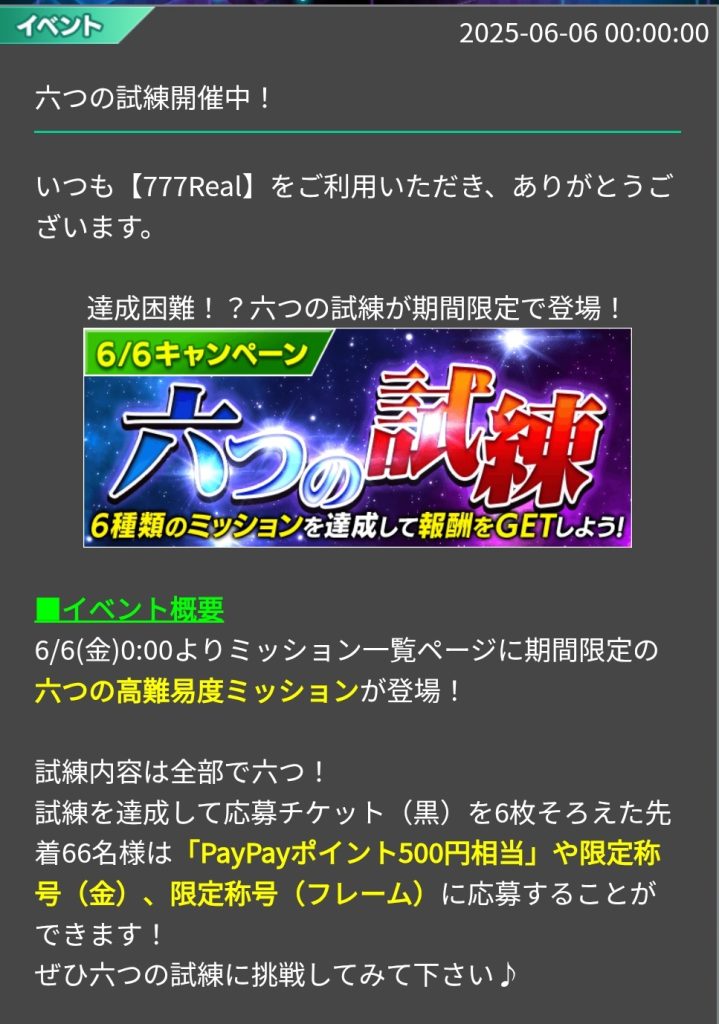 777Realで6月6日から【6つの試練】と言うイベントが開催されました
