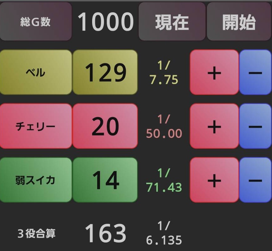 そして、過去3連続で高設定を打っている訳ですが、3回共最初の1000Gはベル確率1/7.5くらいで推移していました