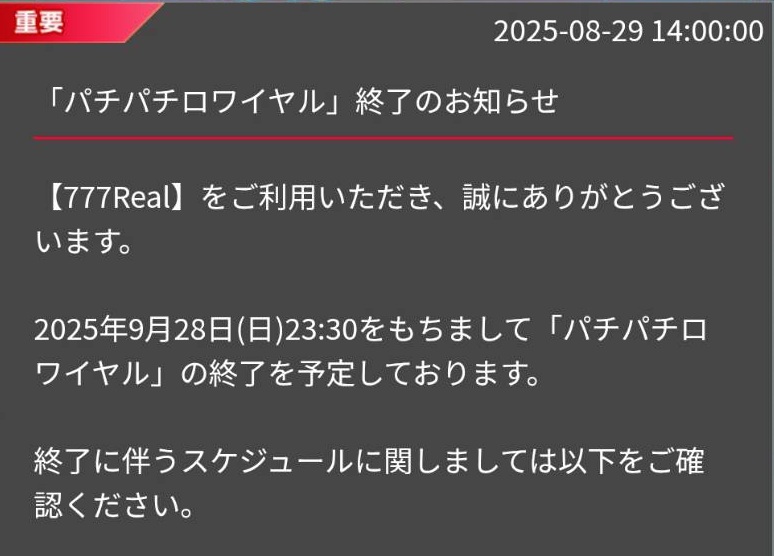 運営が一番推していた筈のパチパチロワイヤルがこの度終了する運びとなりました