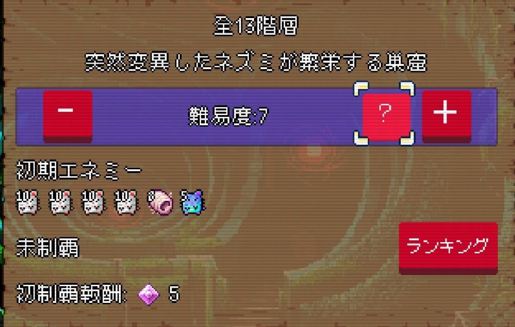 ゲームのステージは難易度で深さが変わるタイプの階層型で1フロア固定です