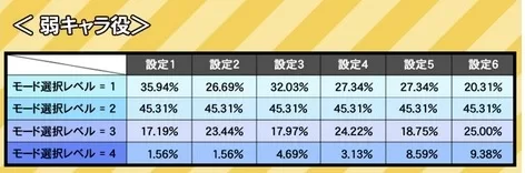 更に言うと、弱キャラ役を引いたとしても設定6でも約20%で最低のモード1に飛ばされます。ホールで6の負けパターンがコレです