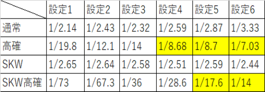なんですが、高設定だと良いモードに飛びやすく、また設定56だとSKW高確率が現実的な確率で飛んできます