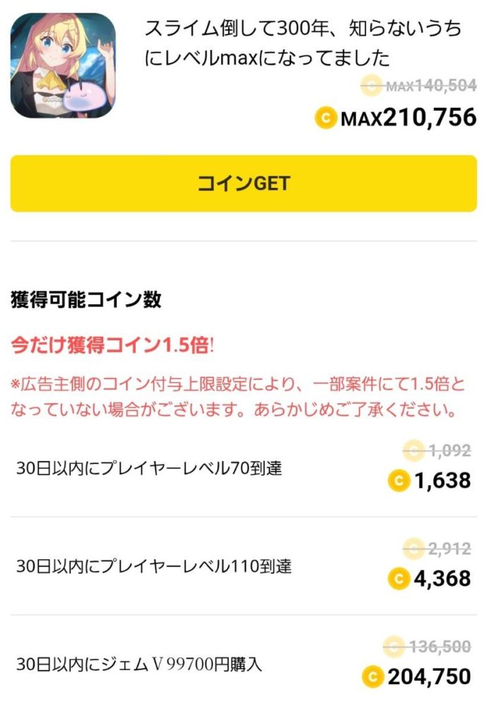 1.5倍キャンペーン前だとレベル105で2000コインくらいの案件でしたので