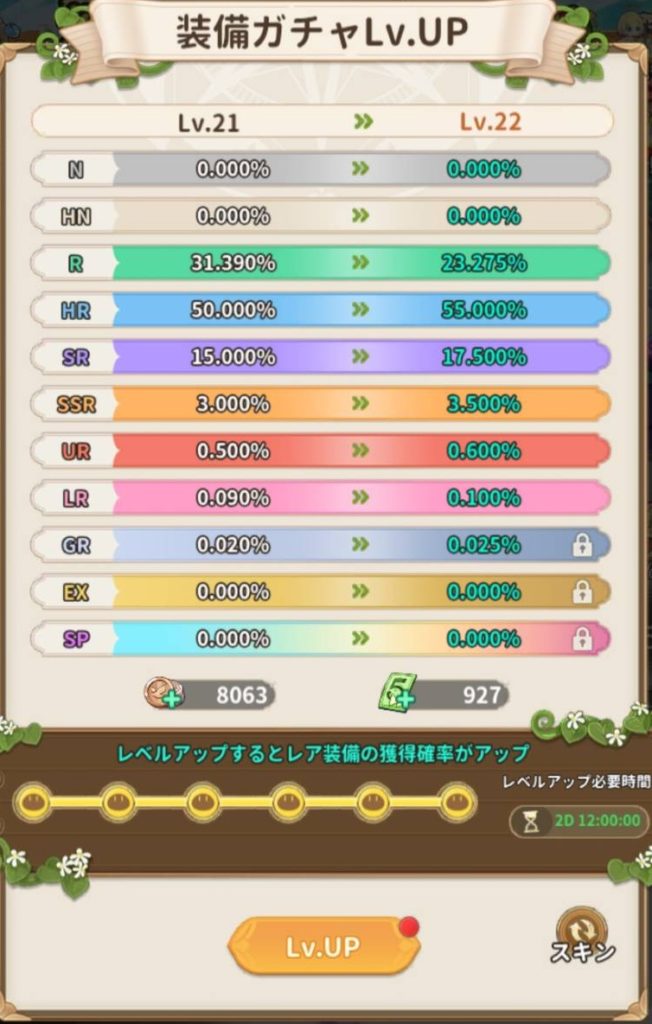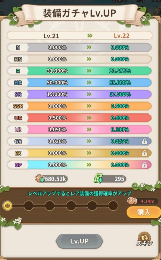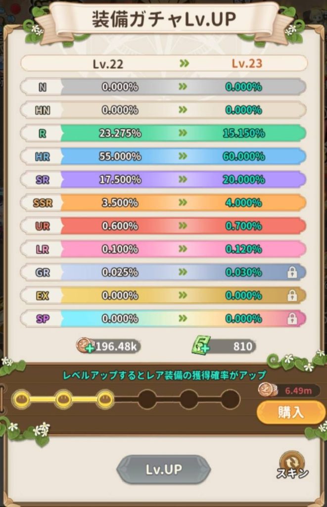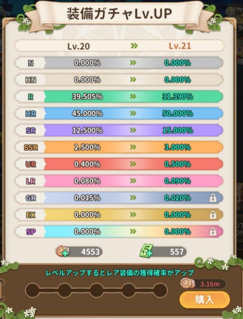 また、超低確率で超高レアリティの装備を手に入れる事でサクサクゲームがクリアできる。と言う(G123側の)事故防止の為、高レアリティの装備に関しては排出確率は0%に設定されていますのでご安心してください