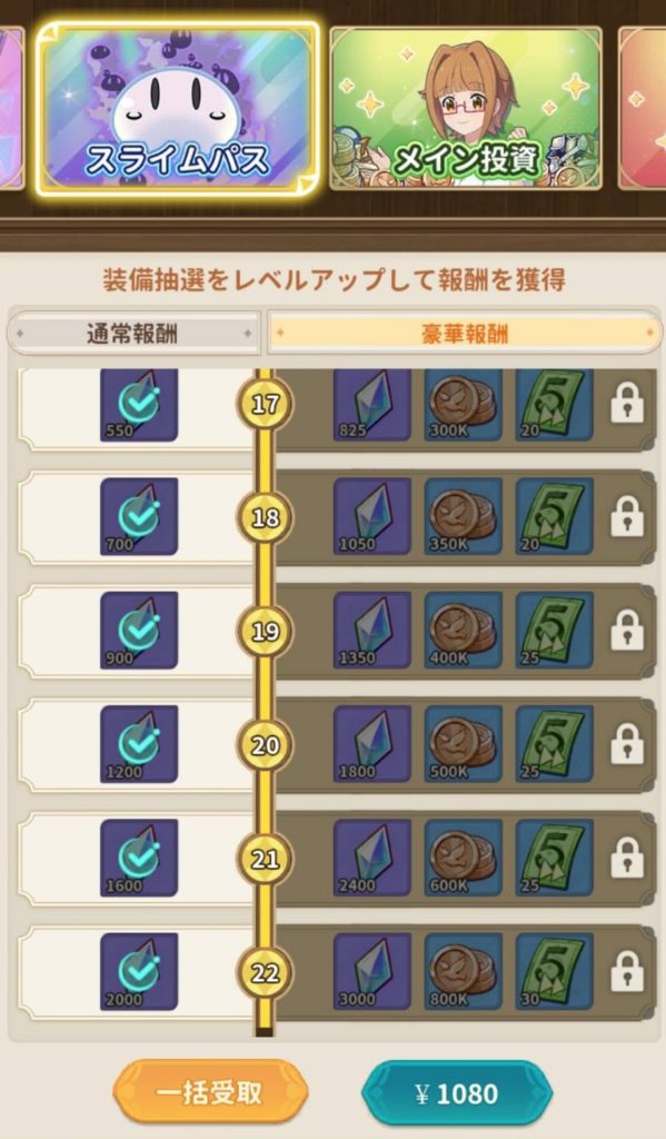 しかし、今回は1080円のスライムパスなので課金割合としては17%