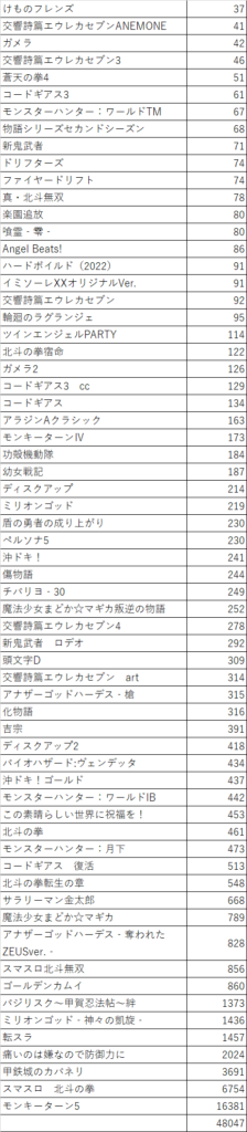 こちらは2024年の記事でプレイヤー数を計算した時に各機種毎に遊戯人数をまとめた表になりますが