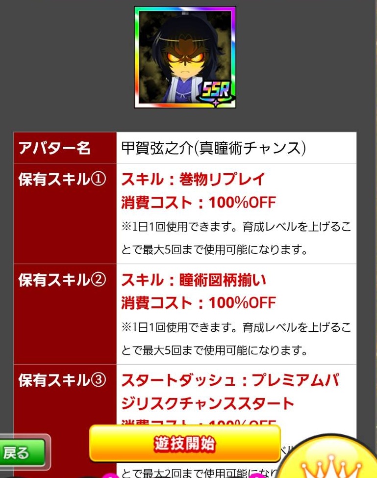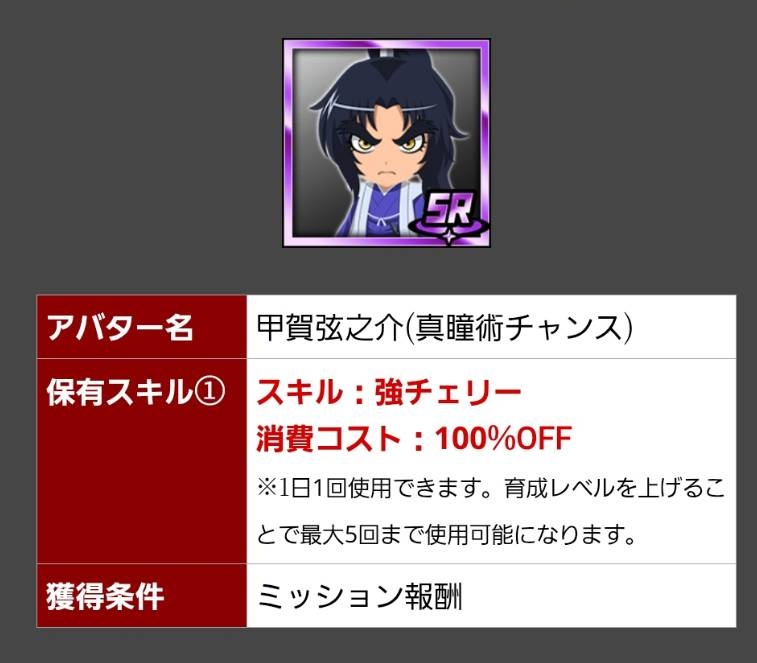 前回のギアスR2の時は獲得からSSRまでの区間が結構空いていたので育成するのもアリでしたが、今回のSR弦之介は残念ながら使い道は無いでしょう