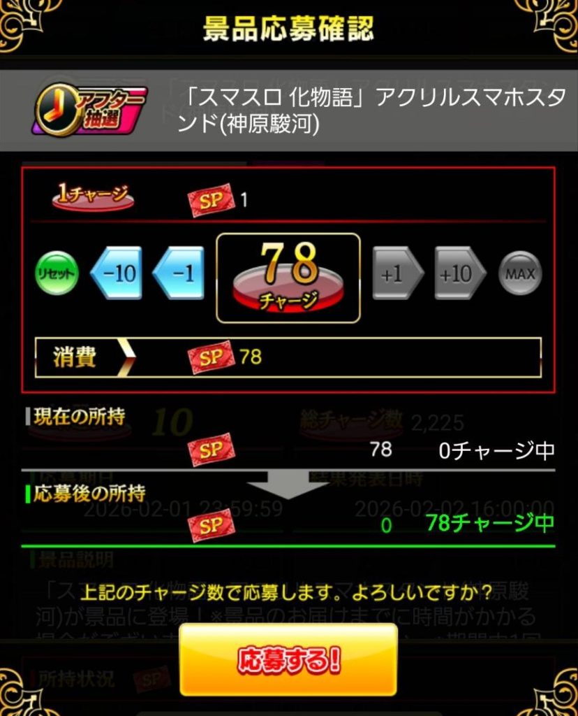 倍率をどこまで確保できるか?と超倍々中のキャラ保留を獲得して且つ倍率2倍抽せんに受かるか?がポイントなので