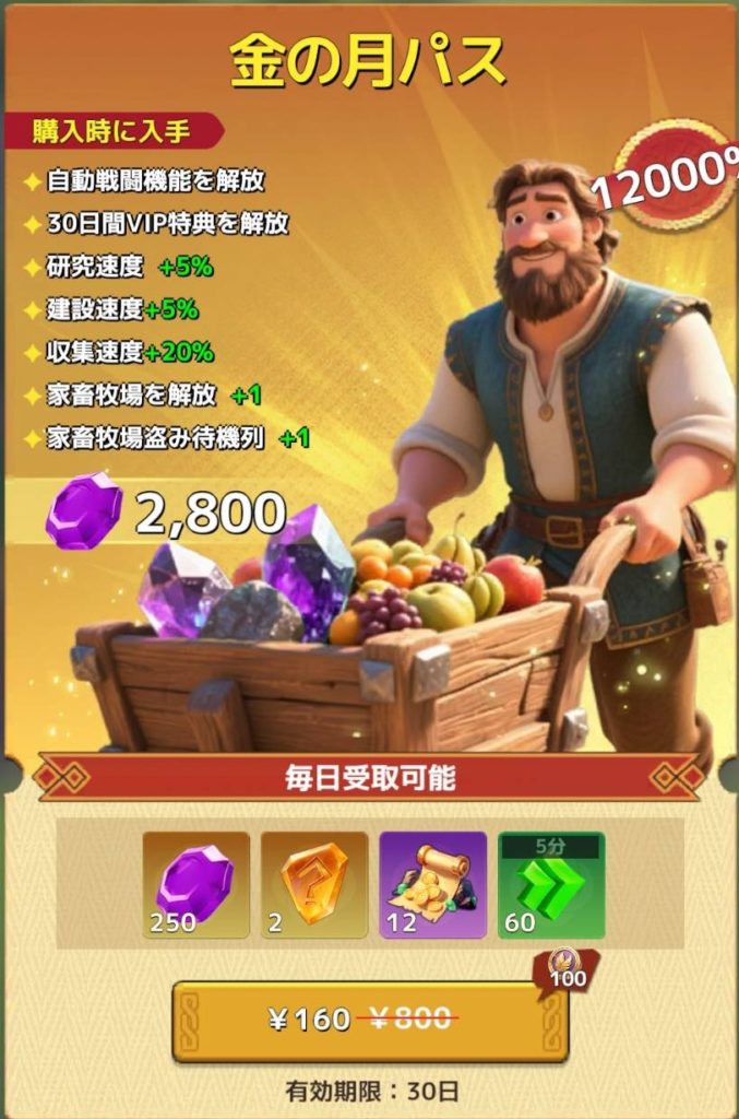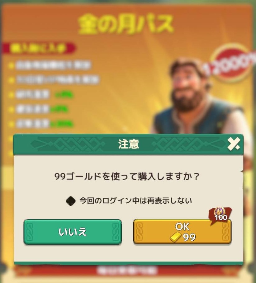 その後、金の月パスの購入をクリックするとゴールド使用画面へ移りました