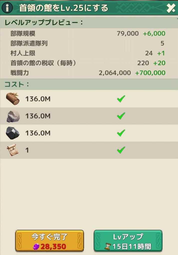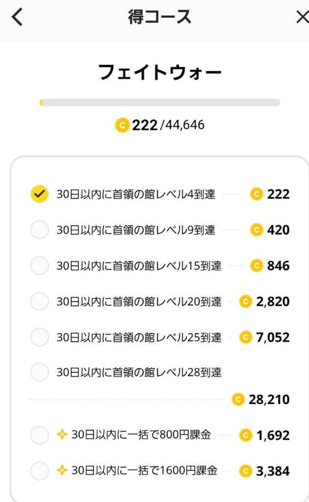 合計で44646コインが貰えますが、城レベル28は不可能みたいなので今回は25までかな?