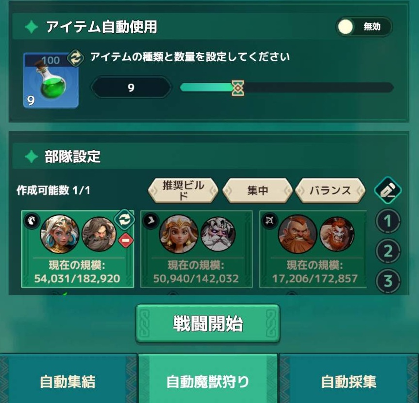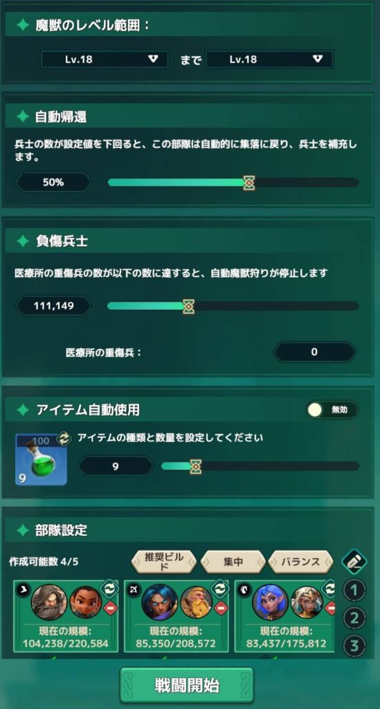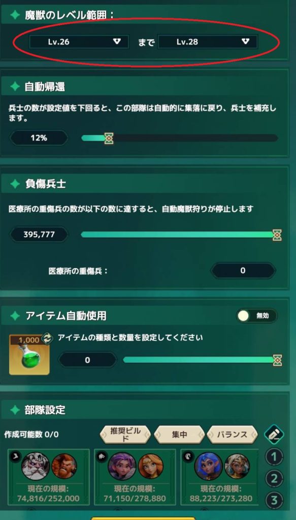 魔獣レベルが低すぎると資源ボックスのドロップ量が少なくなりますし、高すぎると被害が大きすぎて治療が間に合わず、資源採集の兵が足りなくなります