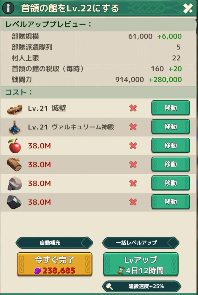21日目の夕方頃に首領の館の資源が揃ったので建築→加速で速攻終了でした