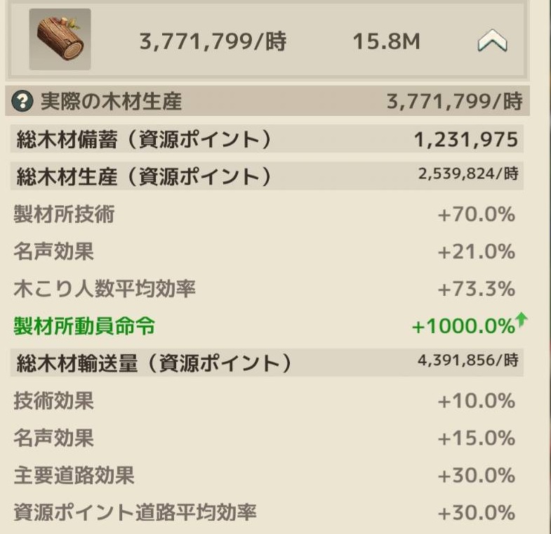 資源ポイントは食料が20日目くらいに輸送状態が切れていて、木材/石材/鉄鉱は輸送が残り10時間くらいの状態でした