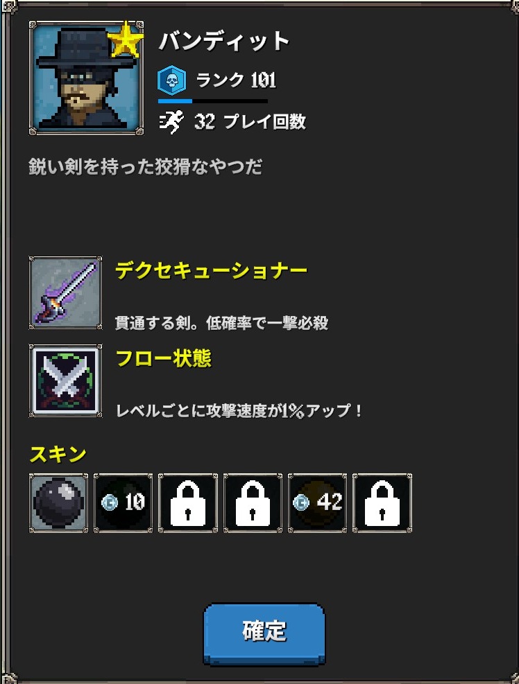 バンディットはキャラ特性が攻撃速度アップなのと、初期武器がデクセキューショナーなので扱いやすいです