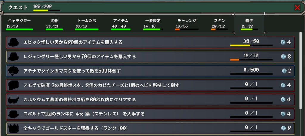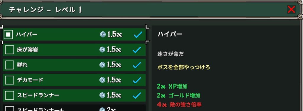 呪いを積むと事故死が多くて、ここ数日は経験/運/クオンティティ/カオスで難易度はギミックで積むプレイをしています。