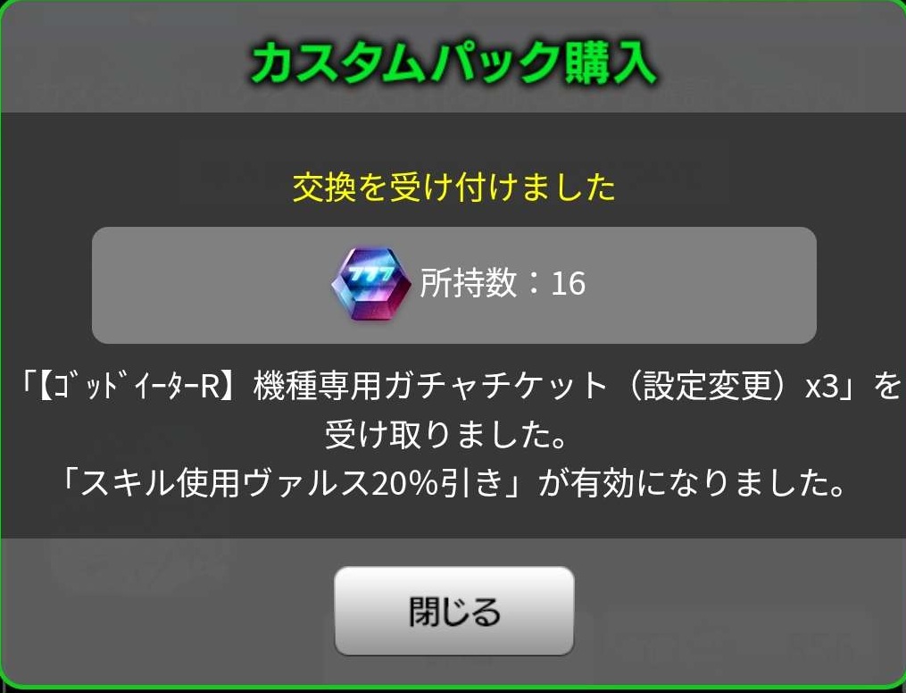 とは言え、スキアバガチャの2回目以降が6600円なので、それを考えると設定券ガチャの方が確実性はありそうです